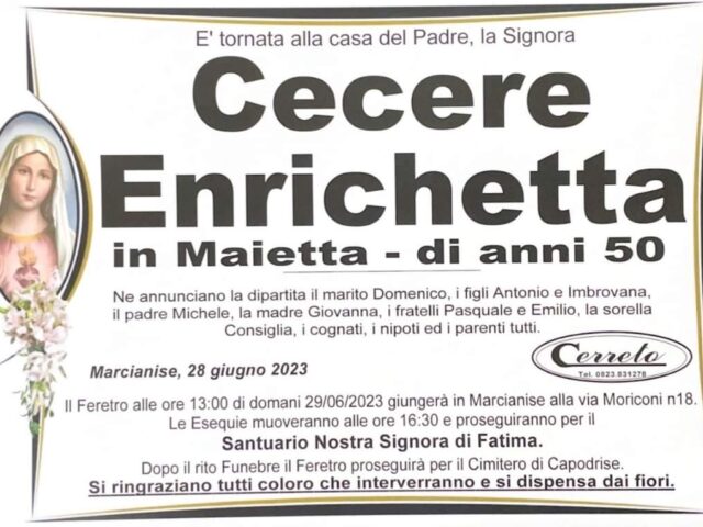Marcianise/Capodrise. Saranno celebrati oggi pomeriggio alle 16 nella chiesa di Nostra Signora di Fatima a Marcianise i funerali di Enrichetta Cecere, venuta a mancare ieri all’età di 50 anni.