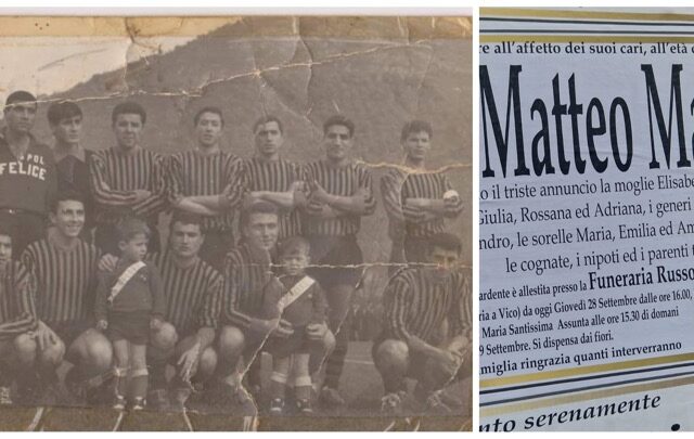Santa Maria a Vico/San Felice a Cancello. Lutto nella valle per la dipartita del professore Matteo Mattia, storico calciatore della mitica Sanfeliciana, nella foto d’epoca è il primo a destra in basso.