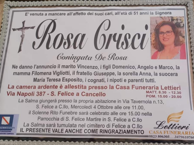 Una cara madre di famiglia che è volata via troppo presto, mancherà a tutti. Rosa lascia il marito Vincenzo De Rosa (autotrasporti), i figli Domenico, Angelo e Marco, la madre Filomena, il fratello Giuseppe, la sorella Anna, la suocera Maria Teresa, i cognati, i nipoti ed i parenti tutti.