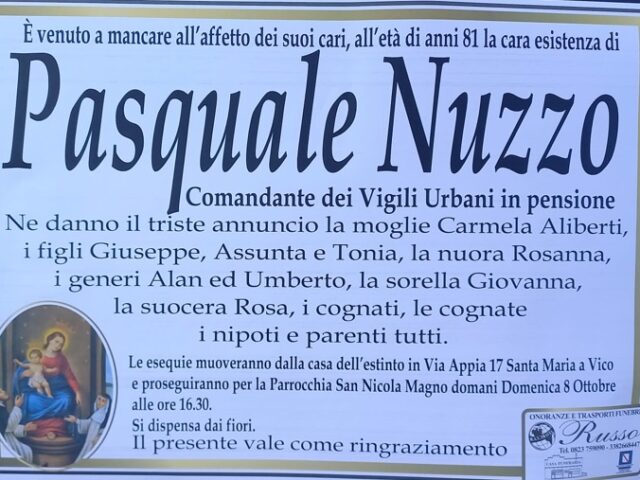 Santa Maria a Vico. Lutto per la città di Santa Maria a Vico, addio all’ex storico comandante dei vigili urbani, Pasquale Nuzzo, spentosi alle ore 11 di oggi all’età di 81 anni. La salma è presso l’abitazione di famiglia in via Appia, zona Messercola. Un uomo molto stimato che ha fatto parte della storia della comunità.