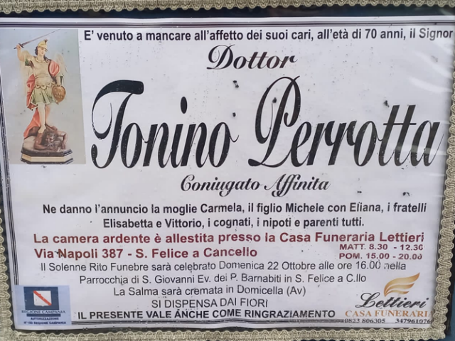 AGG. I funerali del dottor Antonio Perrotta si svolgeranno domani pomeriggio alle 16 nella chiesa dei padri barnabiti, di fronte al Comune di San Felice. La salma sarà poi cremata.