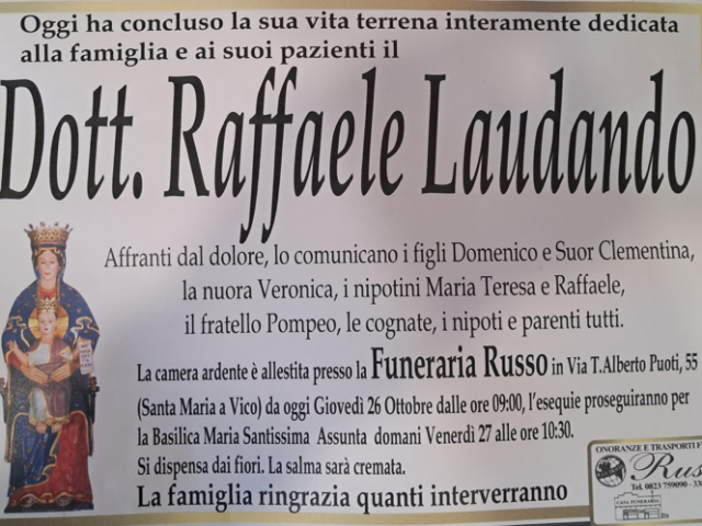 Santa Maria a Vico. Addio all’ex sindaco Raffaele Laudando (1988-90), aveva 76 anni e una vita spesa interamente per la famiglia e per i suoi pazienti.