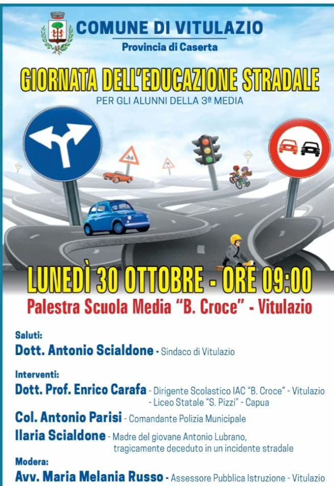 Si terrà lunedì 30 ottobre, con inizio alle ore 9.00, la “Giornata della Sicurezza Stradale”. L’importante evento vedrà come teatro la scuola media “Benedetto Croce” di Vitulazio. Interverranno all’iniziativa Antonio Scialdone, Sindaco di Vitulazio; Enrico Carafa, Dirigente Scolastico IAC “Benedetto Croce” e del Liceo Statale “Salvatore Pizzi” di Capua; Antonio Parisi, Comandante della Polizia Municipale di Vitulazio; il prezioso intervento di Ilaria Scialdone, madre del giovane Antonio Lubrano tragicamente deceduto in un incidente stradale. Moderatore dell’evento Maria Melania Russo, Vicesindaco e delegata alle politiche sociali del comune di Vitulazio. La giornata è dedicata agli alunni della terza media.