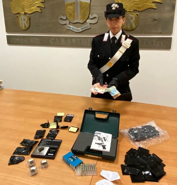 I militari dell’Arma, nel corso di mirati servizi finalizzati alla repressione dei reati in materia di stupefacenti hanno eseguito delle perquisizioni domiciliari, personali e veicolare al termine delle quali hanno rinvenuto e sequestrato sostanza stupefacente del tipo hashish per complessivi gr. 40, un bilancino di precisione, materiale per il confezionamento e 275 euro in denaro contante.