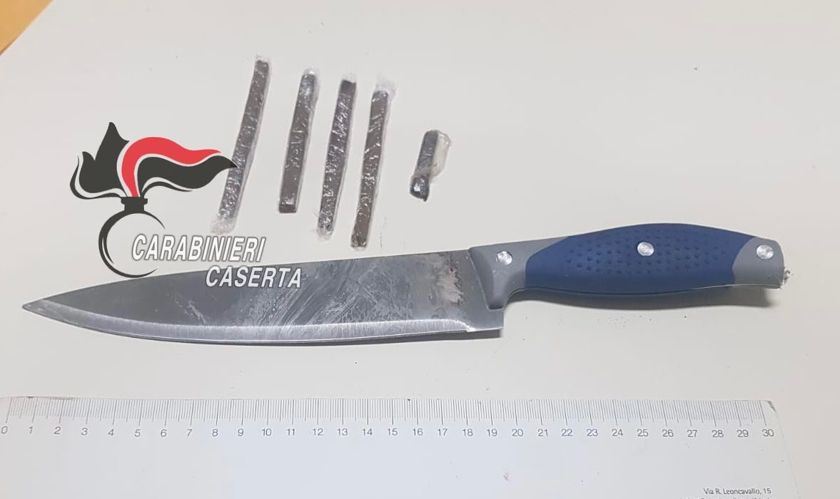 Nel corso della perquisizione personale, oltre al coltello della lunghezza di 32 cm, è stato trovato in possesso di 5 stecche di Hashish per un peso totale di 14,00 gr.