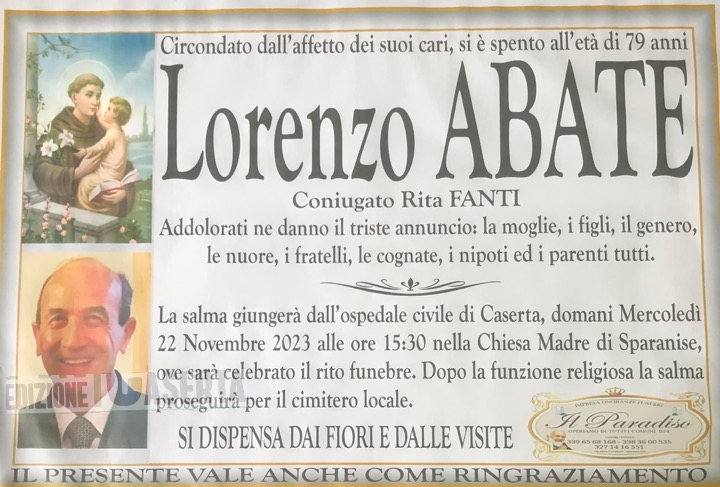 Sparanise. Grande dolore a Sparanise per la dipartita del 79enne Lorenzo Abate, vittima domenica mattina di quel terribile incidente che vi avevamo raccontato in via Capodimonte nei pressi dell’ospizio. La sua auto si era ribaltata e dopo essere stato estratto fu portato d’urgenza all’ospedale di Caserta con un importante trauma cranico.