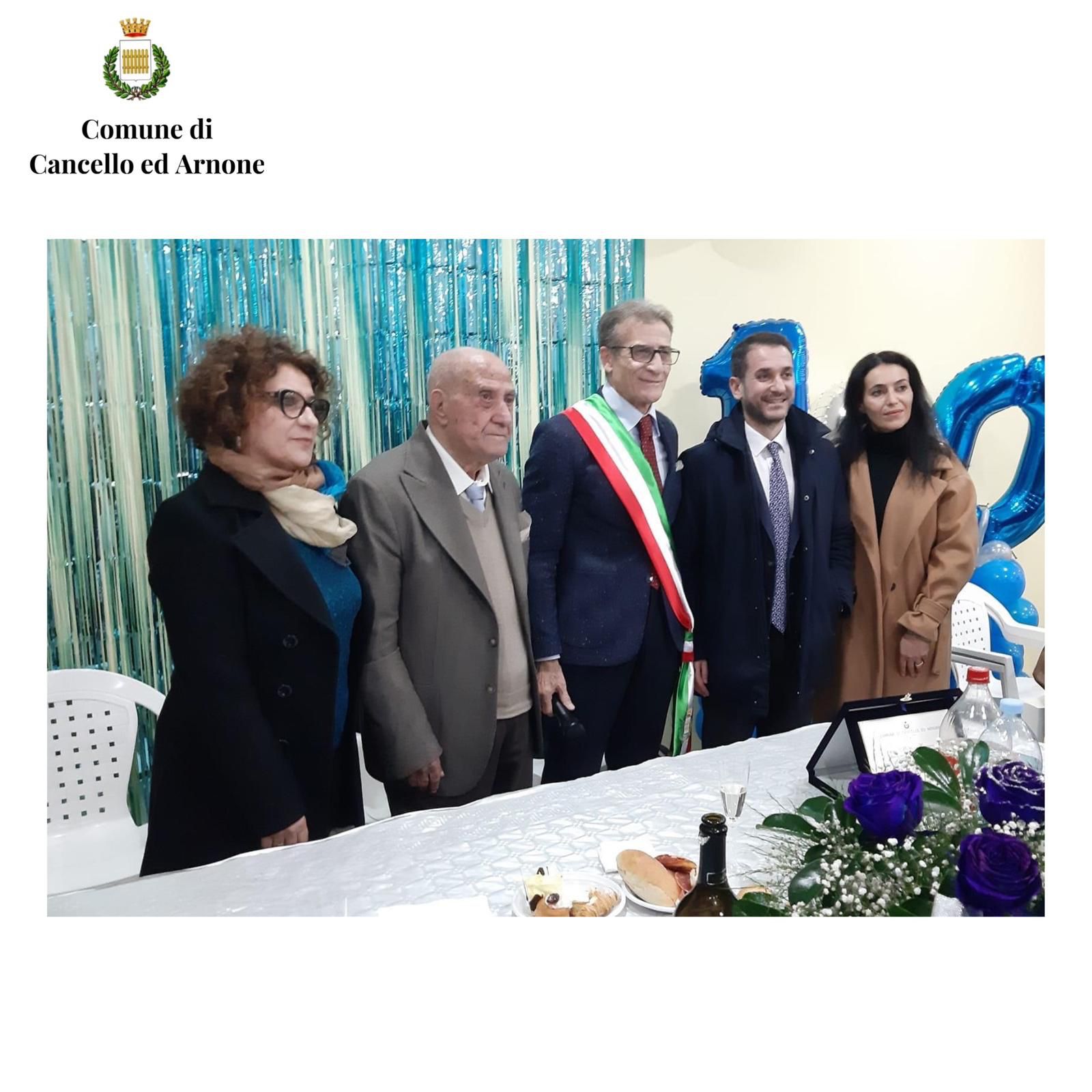 Non poteva mancare il sindaco Raffaele Ambrosca, che, per l’occasione è stato accompagnato dagli assessori Gaetano Ambrosca, Maria Giuditta Biancolella e Giusi Parente, che ha donato una targa di auguri a nome dell’intera amministrazione e di tutta la comunità di Cancello ed Arnone al nuovo centenario.