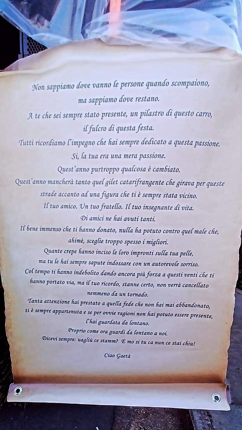 Poi sul carro numero 13 una dedica speciale che riportiamo in calce, con uno sguardo lassù: caro Gaetano questa festa è per te…
