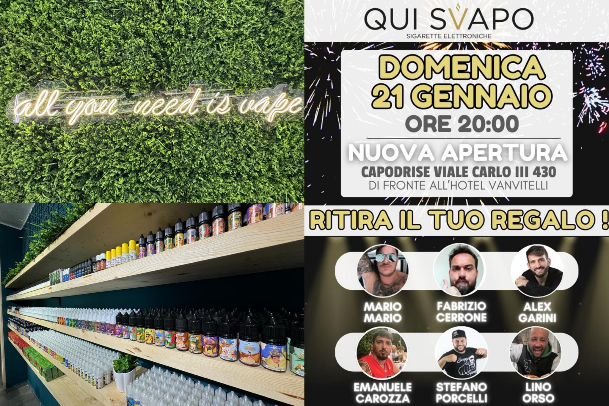 A fare gli onori di casa lo staff di Qui Svapo che si metterà a disposizione dei presenti per illustrare le caratteristiche dei liquidi, le nuove linee della casa, le sigarette usa e getta, i tanti dispositivi che sono in vendita. Davvero un assortimento senza precedenti: chi vuole smettere di dipendere dalle sigarette tradizionali in questo store trova il suo ambiente ideale.
