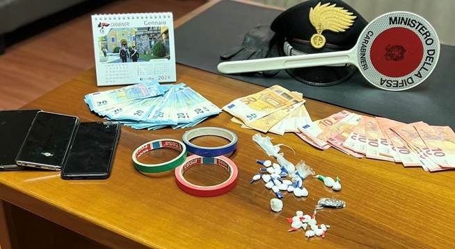 Nel corso della successiva perquisizione domiciliare i carabinieri hanno rinvenuto, in camera da letto, nascosti all’interno del primo cassetto del comò, ulteriori 744 euro in contanti, un bilancino di precisione elettronico, ulteriori 27 dosi di cocaina, varie dosi di hashish e materiale vario per il confezionamento dello stupefacente. Lo stupefacente rinvenuto, il materiale per il peso e il confezionamento delle dosi e la somma in contanti pari a circa 1000,00 euro, ritenuta provento dell’attività illecita, sono stati sottoposti a sequestro.