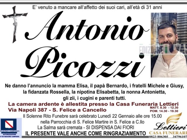 Antonio da tempo combatteva contro un brutto male e alla fine si è dovuto arrendere. Lascia i genitori Elisa e Bernardo, i fratelli Michele e Giusy, la fidanzata Rossella, la nipotina Elisabetta, la nonna e gli altri parenti. La camera ardente è allestita presso la casa funeraria Lettieri. Il rito funebre si terrà domani alle 15 nella chiesa centrale di San Felice Martire.