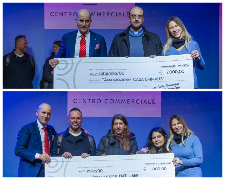 Sono stati il vicepresidente del Consorzio Esercenti del Centro Commerciale Campania, Gennaro Santoro, e la direttrice del Centro Laura Puoti a consegnare l’assegno di 7.000 euro nelle mani del rappresentante della Casa Emmaus di Caserta, don Antimo Vigliotta, direttore della Caritas Diocesana, che ha ritirato anche un assegno da 3.000 euro destinato alla mensa per i poveri della Parrocchia Nostra Signora di Lourdes. L’avvocato Alessandra Pratticò, in rappresentanza della associazione “Nati Liberi”, ha ricevuto un assegno di 1.000 euro.