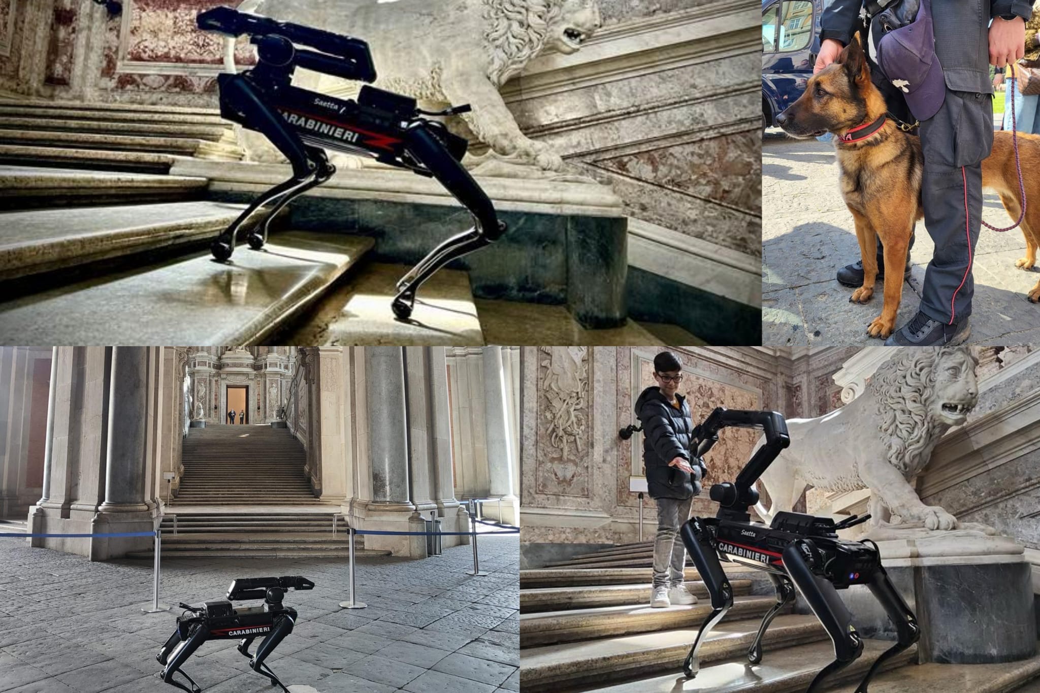 In particolare il Cane robot “Saetta” ed il suo conduttore hanno interagito con i presenti accompagnandoli sino al vestibolo superiore del Palazzo Reale affrontando, con tutta naturalezza, i numerosi gradini dello scalone reale.