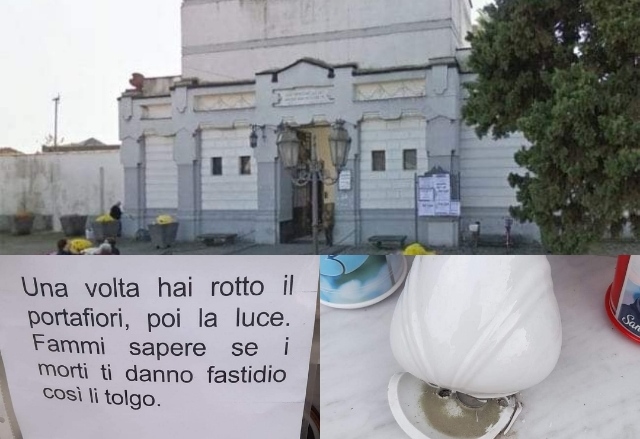 “Ognuno entra, esce e fa quello che vuole: rubano ceri fiori danneggiano lapidi come è successo alla lapide dei miei cari. Gente di pochissimo valore umano e civile! Se per andare ad ornare la lapide del tuo caro defunto, e i miei defunti ti danno fastidio che non vai bene a mettere la scala basta che lo dici io li tolgo da lí” ha scritto il parente di un defunto toccato dalla mano vile dei delinquenti.