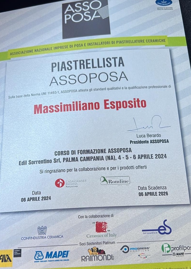 Piastrellista certificato da ‘Assoposa’, Esposito è il primo di Terra di Lavoro