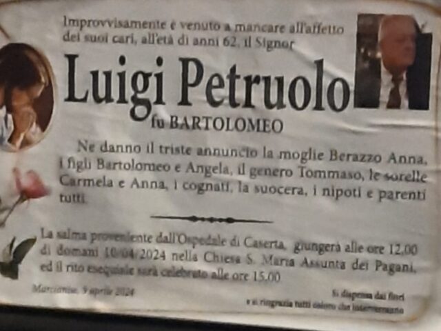 MARCIANISE/CAPODRISE. Saranno celebrati domani alle 15 nella chiesa di Santa Maria Assunta dei Pagani a Marcianise i funerali di Luigi Petruolo, il 62enne morto nel tragico incidente in moto di domenica a Riardo. Lascia la moglie Anna ed i figli Bartolomeo ed Angela, ai quali in queste ore le comunità di Marcianise e Capodrise si sono strette in un unico abbraccio.