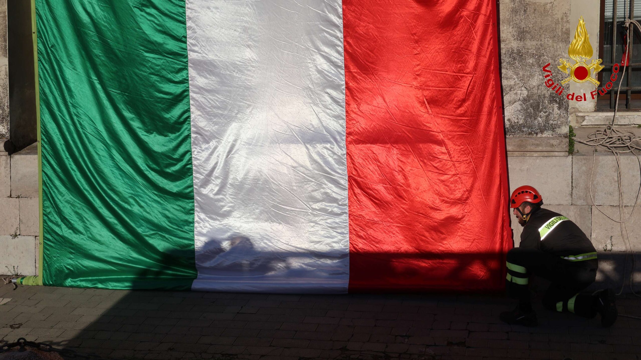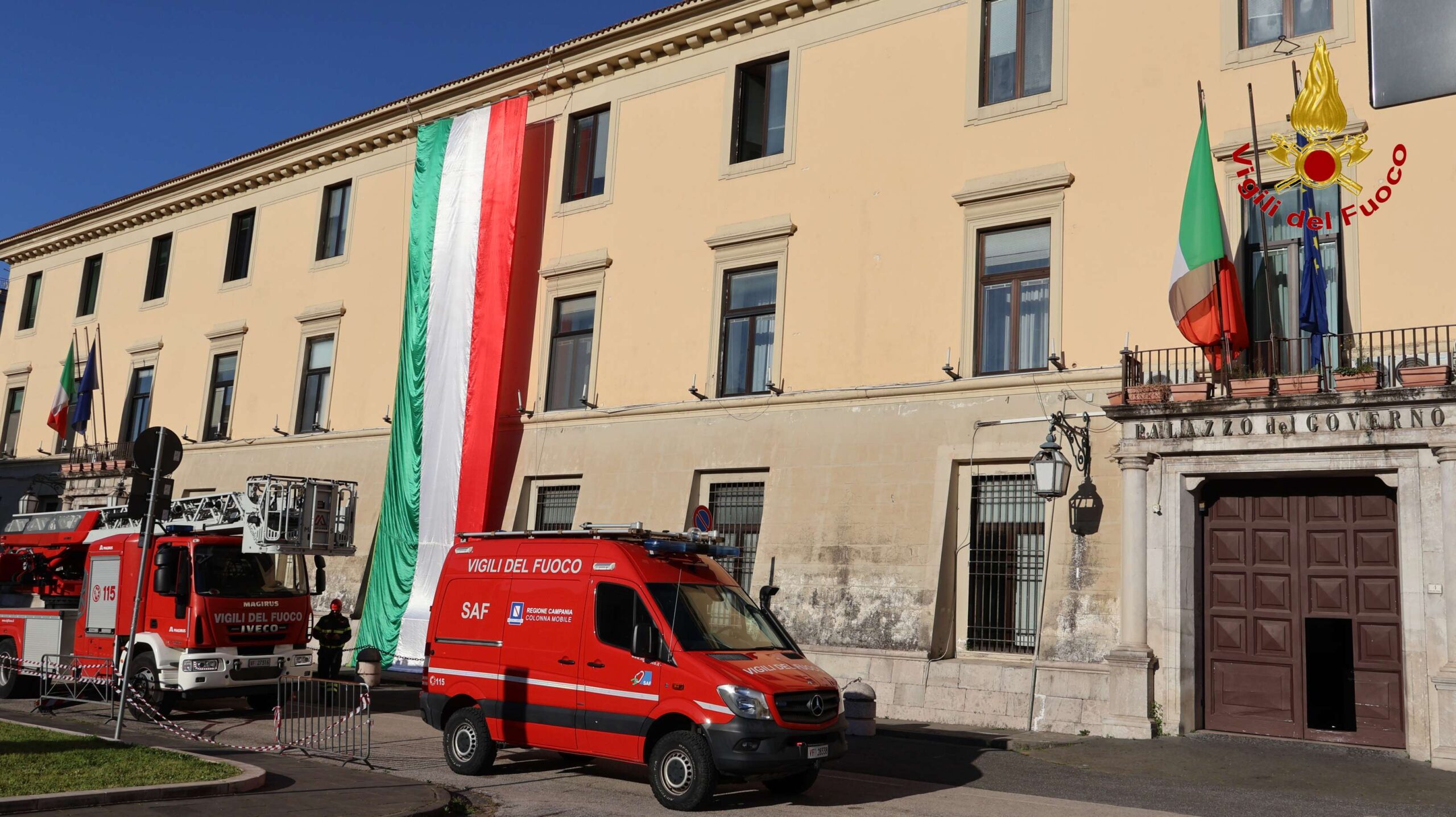 Le operazioni di ancoraggio e posizionamento del tricolore sono state effettuate dal nucleo specializzato S.A.F. ( Speleo Alpino Fluviale) dei Vigili del Fuoco di Caserta con l’ausilio anche di un’autoscala.