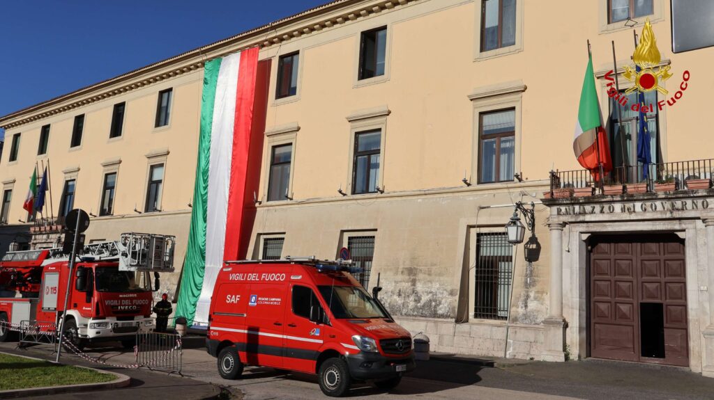 CASERTA. Anche quest’anno, in occasione della festa per la Liberazione d’Italia, il Comando Provinciale dei Vigili del Fuoco di Caserta ha partecipato stendendo il tricolore, simbolo di indipendenza e libertà, sulla facciata del Palazzo del Governo sito in Piazza Vanvitelli a Caserta.