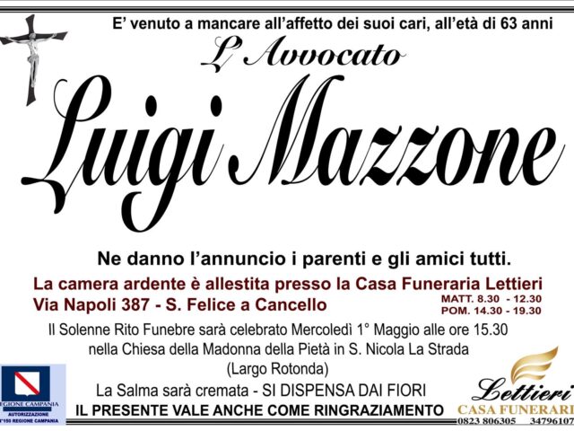 San Felice a Cancello (LC). Fissati i funerali dell’avvocato 63enne Luigi Mazzone, trovato morto domenica pomeriggio nella sua abitazione di San Nicola la Strada in via Caserta.