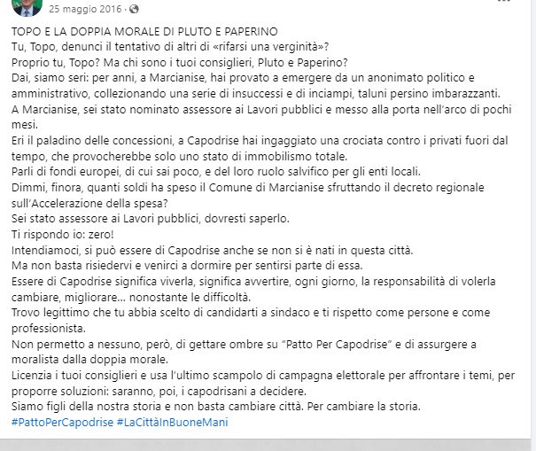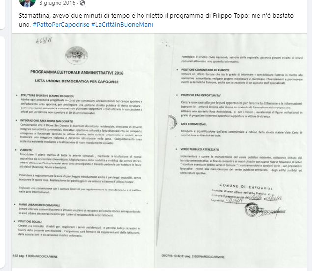 Per non parlare della regia della campagna elettorale di Cecere, la stessa che supportò Angelo Crescente con una campagna aggressiva e sarcastica nei confronti dell’uomo Filippo Topo. Alleghiamo alcuni screen che si trovano sulla pagina facebook dell’ex sindaco e medico di via Santa Croce, basta scorrere un po’ indietro e rendersi conto di come fu trattato l’allora leader di Unione Democratica. Chissà cosa metteranno in campo da qui a breve nei confronti di Negro e company, il nostro auspicio è che sia una campagna corretta, la storia non si cancella e fa parte della nostra quotidianità.