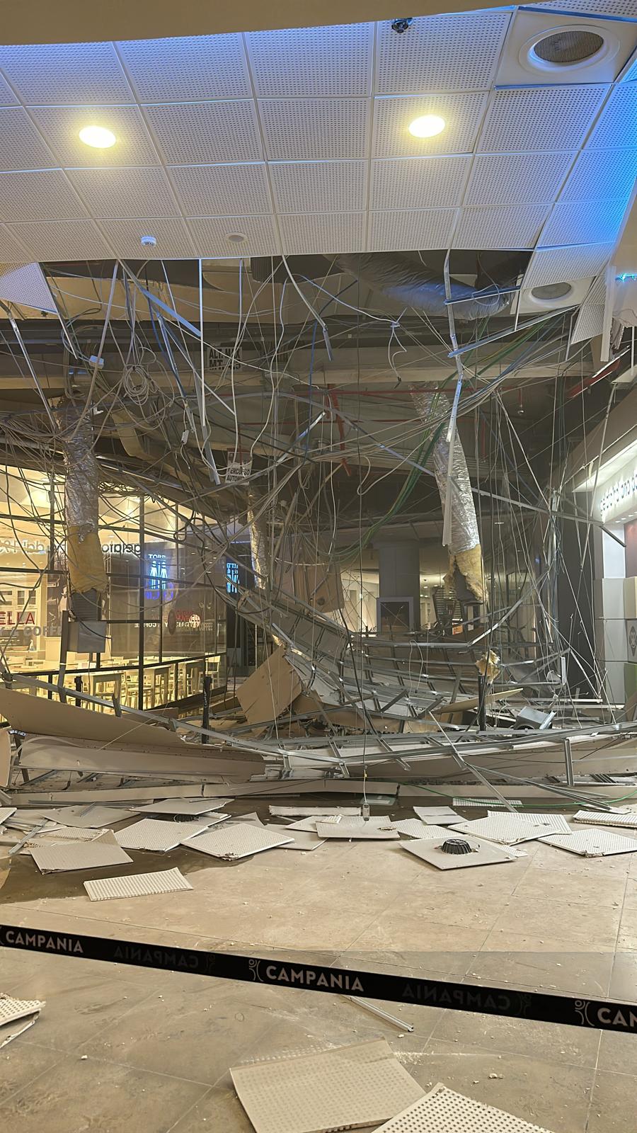 Marcianise. Area del crollo sotto sequestro al Centro Commerciale Campania di Marcianise. I vigili del fuoco di Caserta, su delega della Procura della Repubblica di Santa Maria Capua Vetere, hanno apposto i sigilli alla piazzetta centrale dove è crollato il controsoffitto portandosi dietro cavi e impianti.
