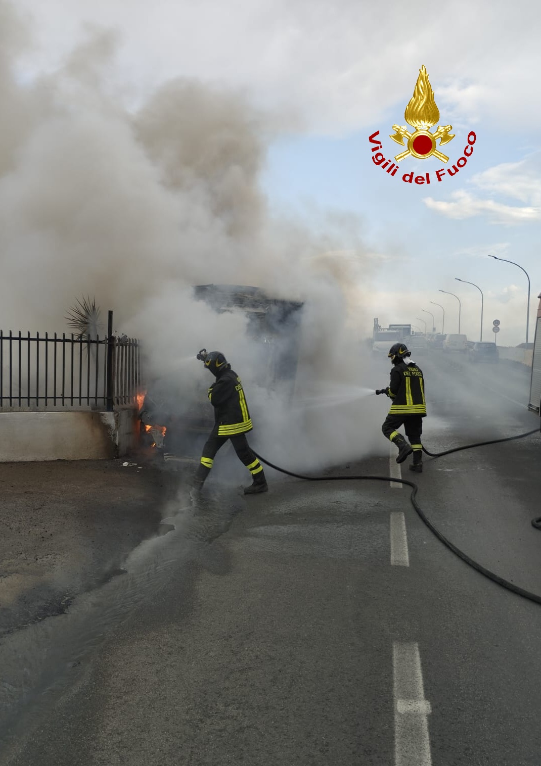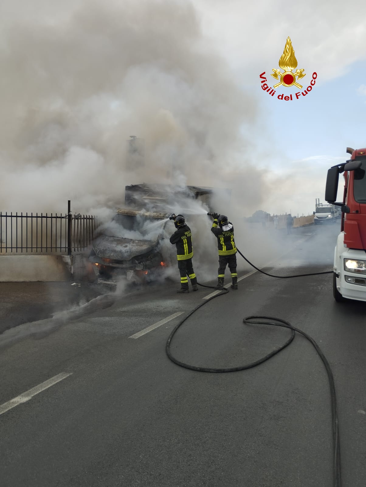 La squadra VVF, con il supporto di un’autobotte, ė immediatamente intervenuta sul posto spegnendo l’ incendio che aveva totalmente coinvolto il veicolo e parte della vegetazione prospiciente la carreggiata, minacciando pericolosamente anche un’attività commerciale presente vicino. Per le operazioni di soccorso è stato necessario chiudere momentaneamente la strada alla circolazione. Dopo aver spento l’incendio l’intera area è stata messa in sicurezza.
