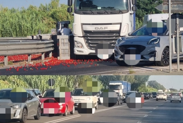 All’incrocio del canale Agnena si è infatti ribaltato un carico di pomodori trasportato da un tir. La merce si è rovesciata a seguito dell’impatto tra il mezzo pensante e una Ford.