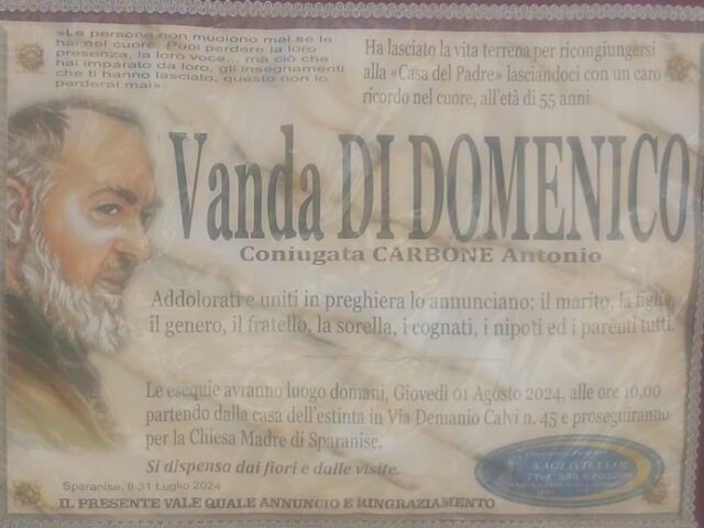 Sparanise. Lutto a Sparanise e nella zona di Calvi Risorta per l’amara dipartita di una madre di famiglia di 55 anni, Vanda Di Domenico.