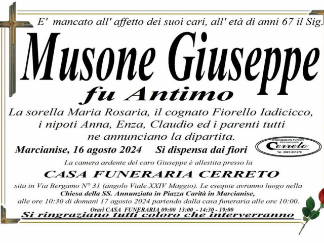 MARCIANISE. Una persona buona lascia questa terra. E’ venuto a mancare all’età di 67 anni Giuseppe Musone, per anni operaio in una fabbrica della zona, portato via da una lunga malattia.