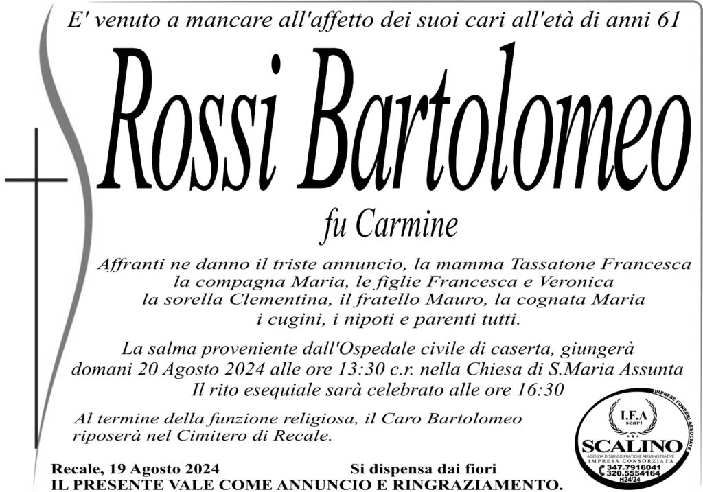 Recale. Un grave lutto ha colpito la cittadina di Recale. E’ venuto a mancare ieri sera all’età di 61 anni Bartolomeo Rossi, ex sottufficiale AM ed ex presidente del consiglio comunale durante le amministrazioni di Americo Porfidia.