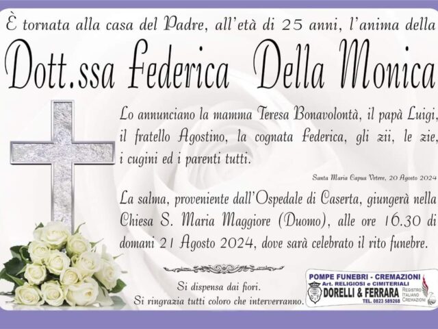 I funerali della giovane saranno celebrati domani alle 16.30 presso il Duomo di Santa Maria Capua Vetere. La salma giungerà direttamente nella città del Foro domani dall’ospedale Sant’Anna e San Sebastiano di Caserta dove Fede era ricoverata e dove è spirata.