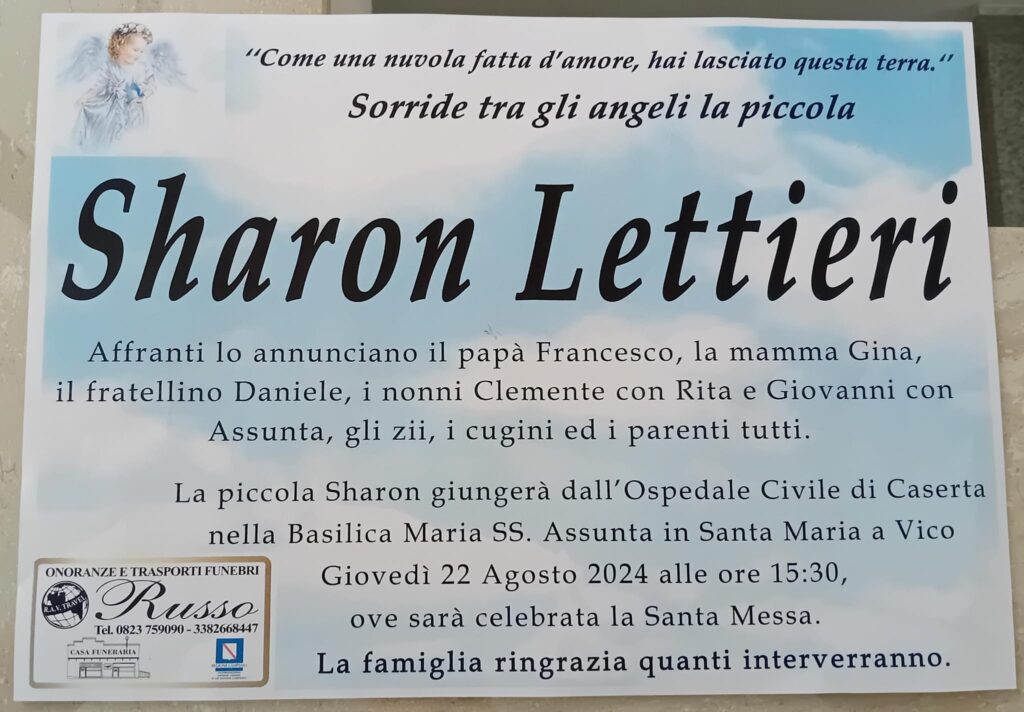 Santa Maria a Vico. Dopo l’autopsia di oggi pomeriggio sono stati fissati i funerali della piccola Sharon Lettieri di 17 mesi, deceduta domenica scorsa all’ospedale civile di Caserta.