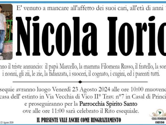 CASAL DI PRINCIPE. Il giorno dell’addio è arrivato: venerdì 23 alle 10 un corteo gonfio di lacrime e rabbia partirà dal civico 7 della seconda traversa di via Vecchia di Vico a Casal di Principe. E’ lì che Nicola Iorio, il 19enne morto in Albania in un incidente con la moto d’acqua, aveva salutato come sempre la sua famiglia prima della partenza.