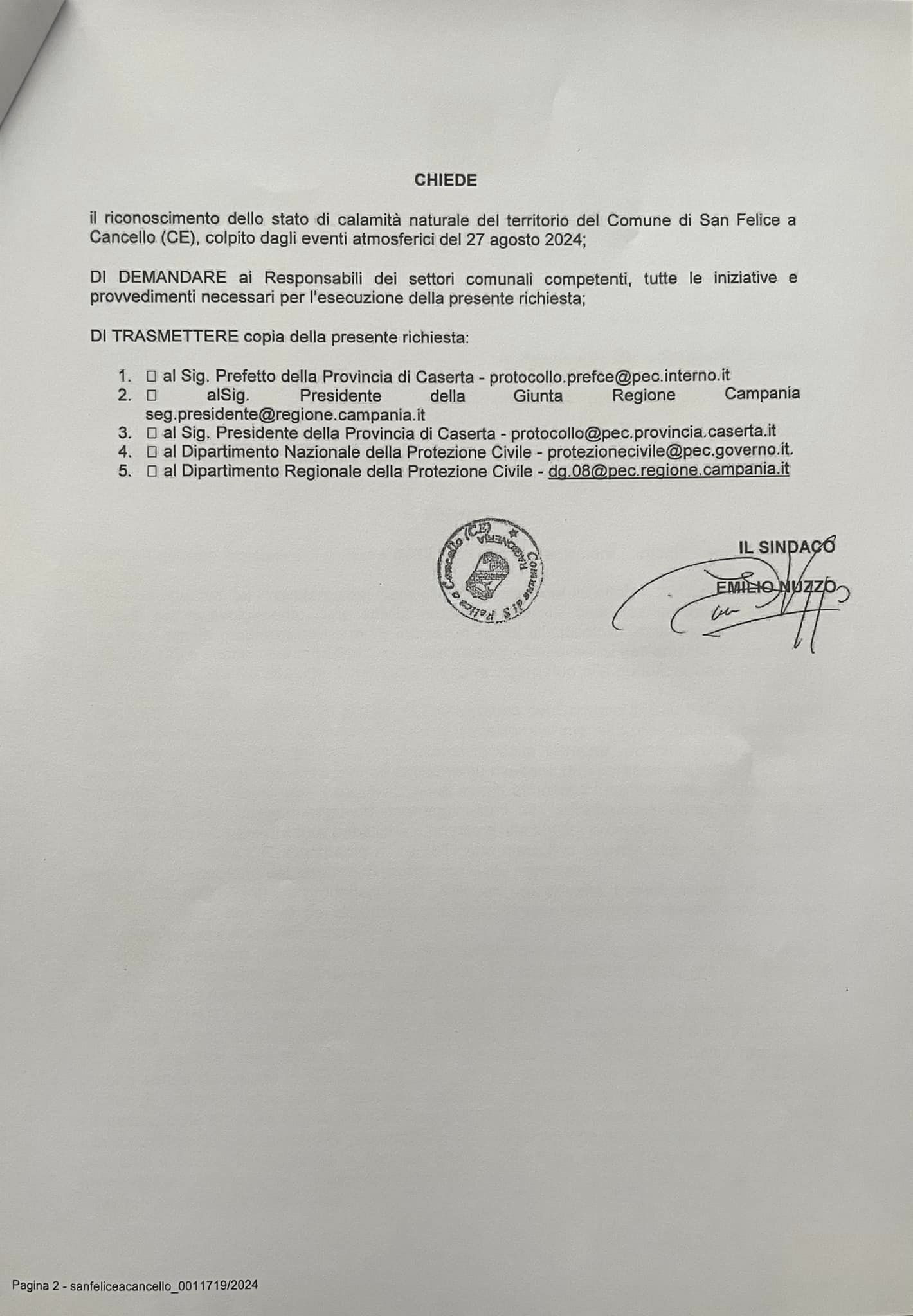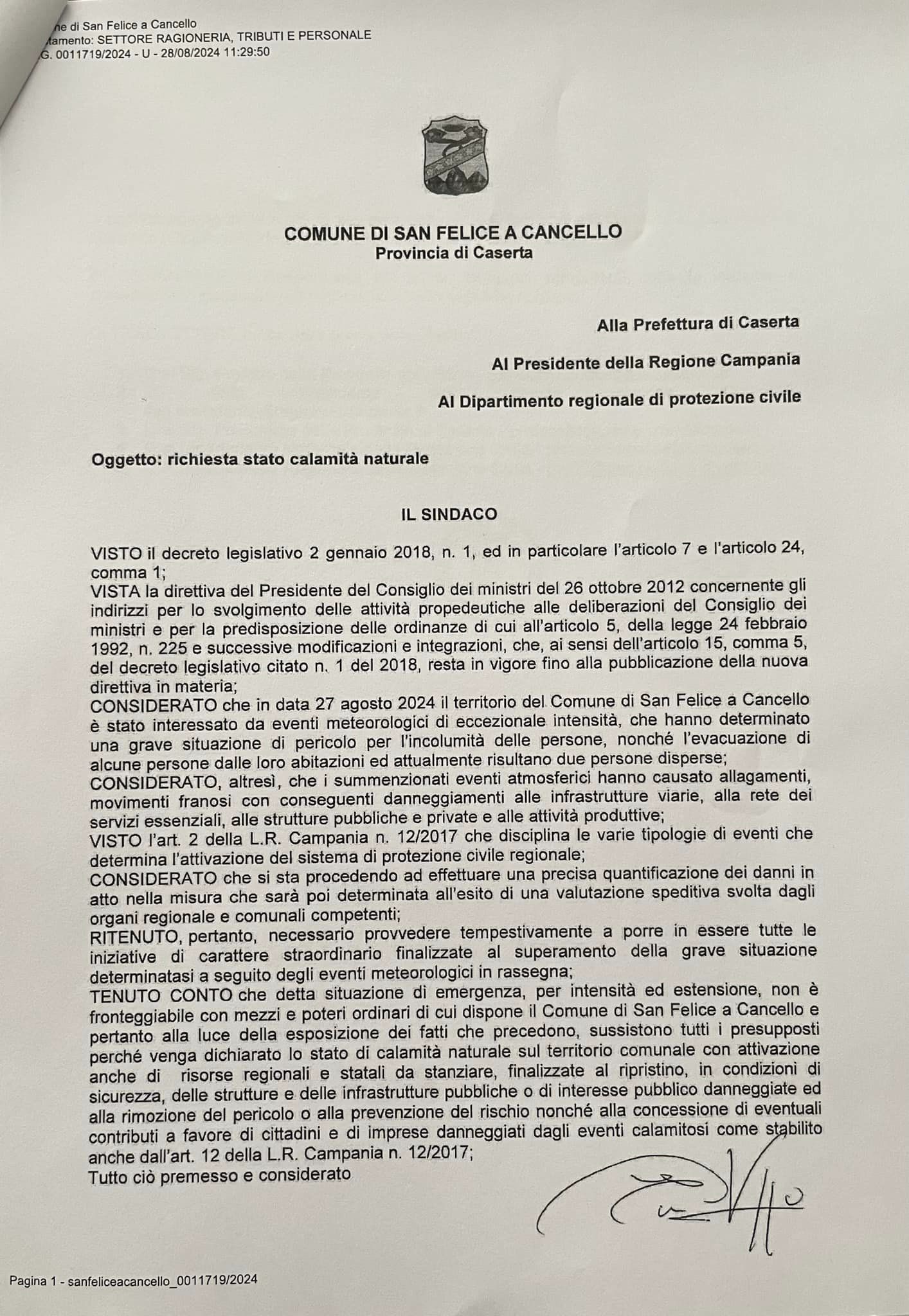 In merito agli eventi atmosferici che si sono verificati durante la giornata di ieri 27 agosto 2024, tenuto conto dello stato di emergenza in cui si trova il nostro territorio, abbiamo inoltrato agli enti competenti la richiesta di stato di calamità naturale.