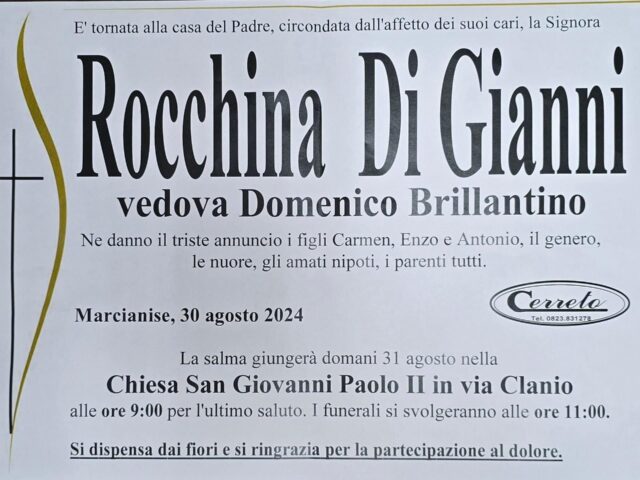 La sua dipartita colpisce i tre figli Carmen, Enzo e Antonio e il genero Antonello Velardi, ex sindaco di Marcianise.
