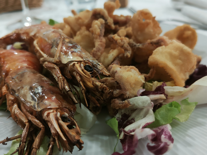 Per il secondo l’abbiamo toccata piano: pezzogna al forno ripiena di speck accompagnata da 2 gamberoni arrostiti, un portata ideale per chi arriva alla fine di un pranzo, leggera e gustosa, così come la frittura di pesce.