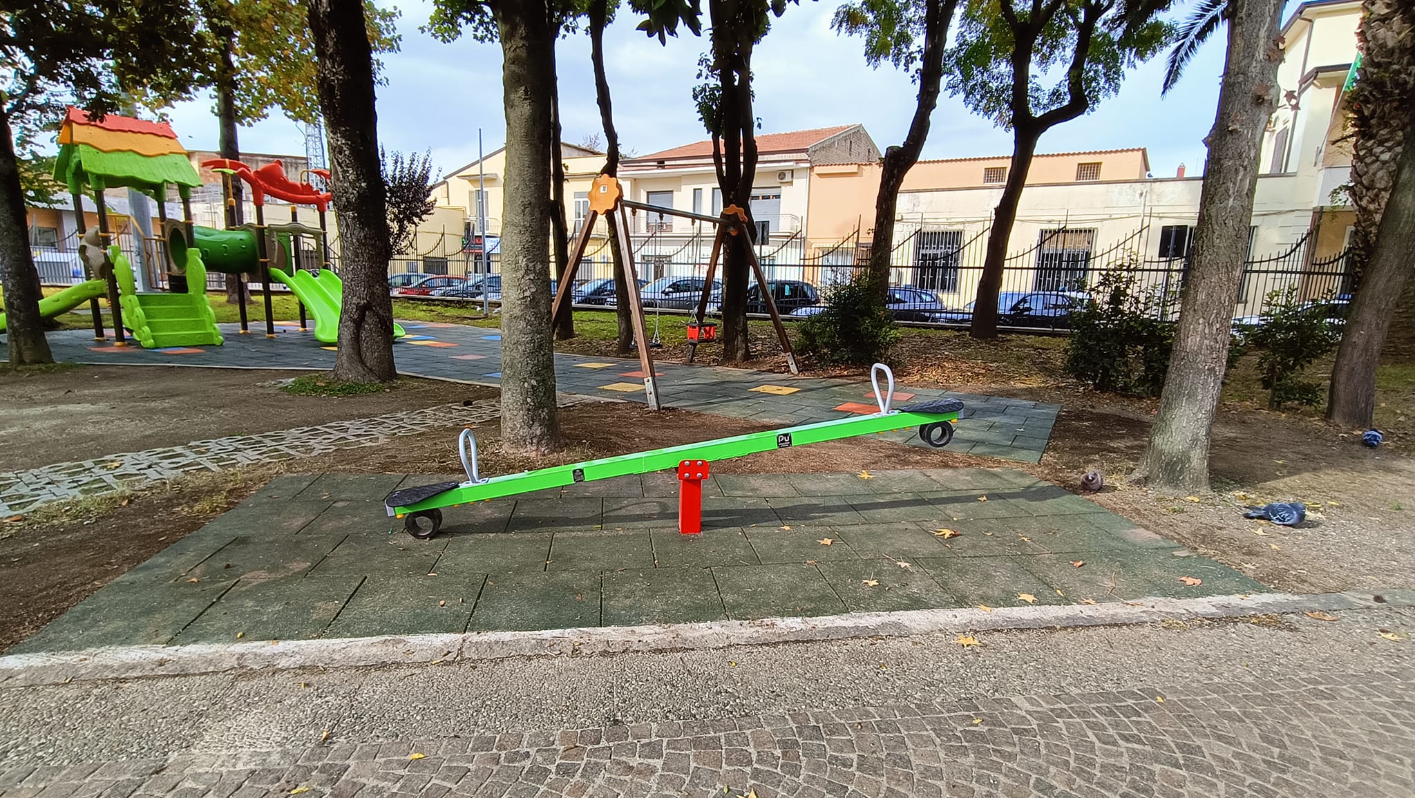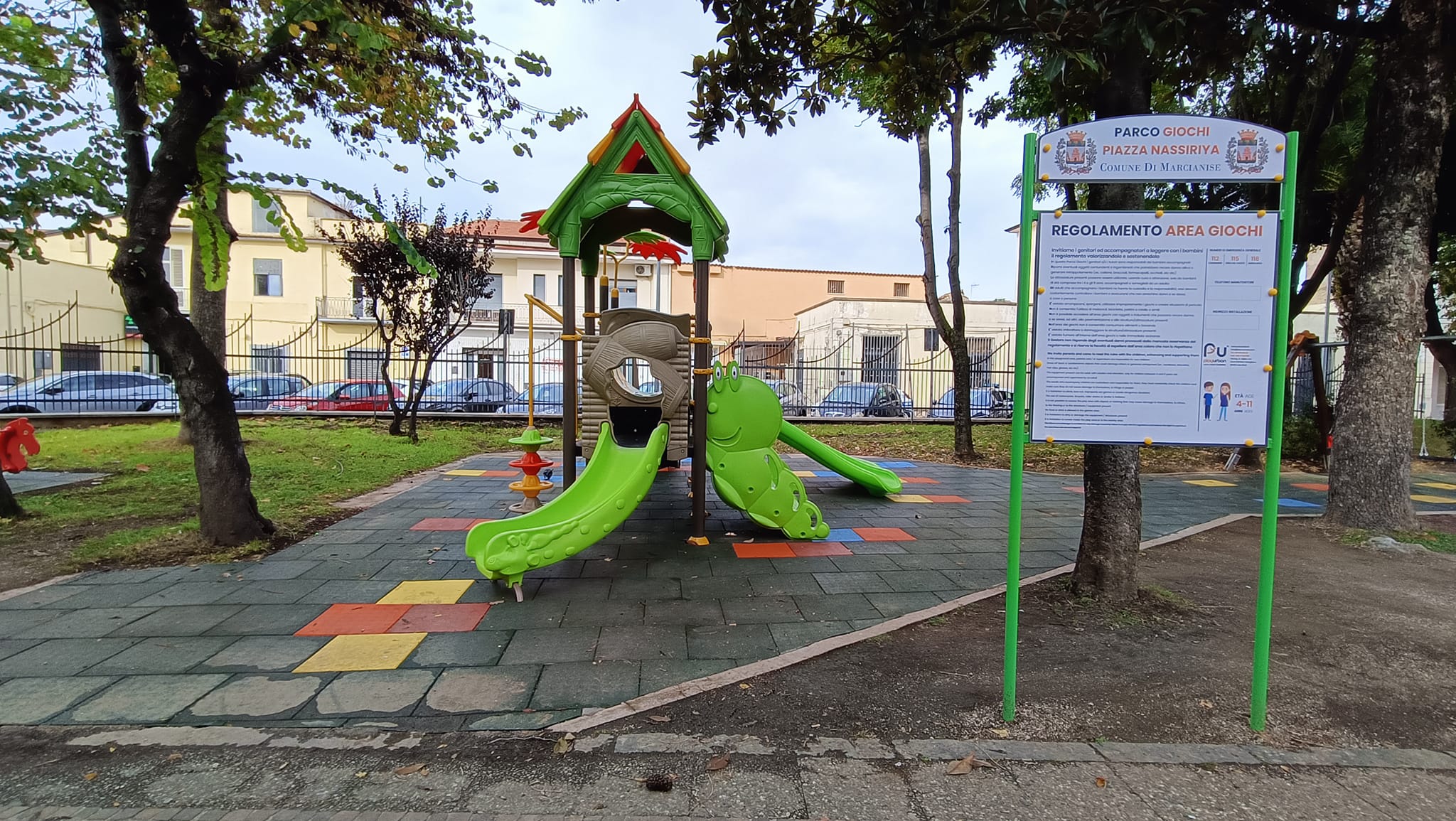 Nella villetta comunale di Piazza Caduti di Nassiyria sono state smontate e smaltite le vecchie giostrine che erano state più volte oggetto di raid vandalici, quindi non più sicure per i bambini, e installati un castello in miniatura, due giochi a molla, una giostra girevole e un’altalena bilico. Inoltre, per rendere fruibili in condizioni di massima sicurezza tutte le attrezzature, è stata eseguita la posa in opera di una pavimentazione antitrauma alla base di tutte le giostrine e l’implementazione del sistema di illuminazione con l’installazione di 6 nuovi impianti.