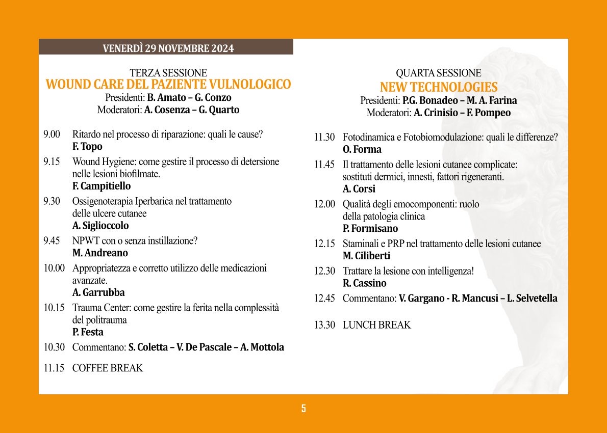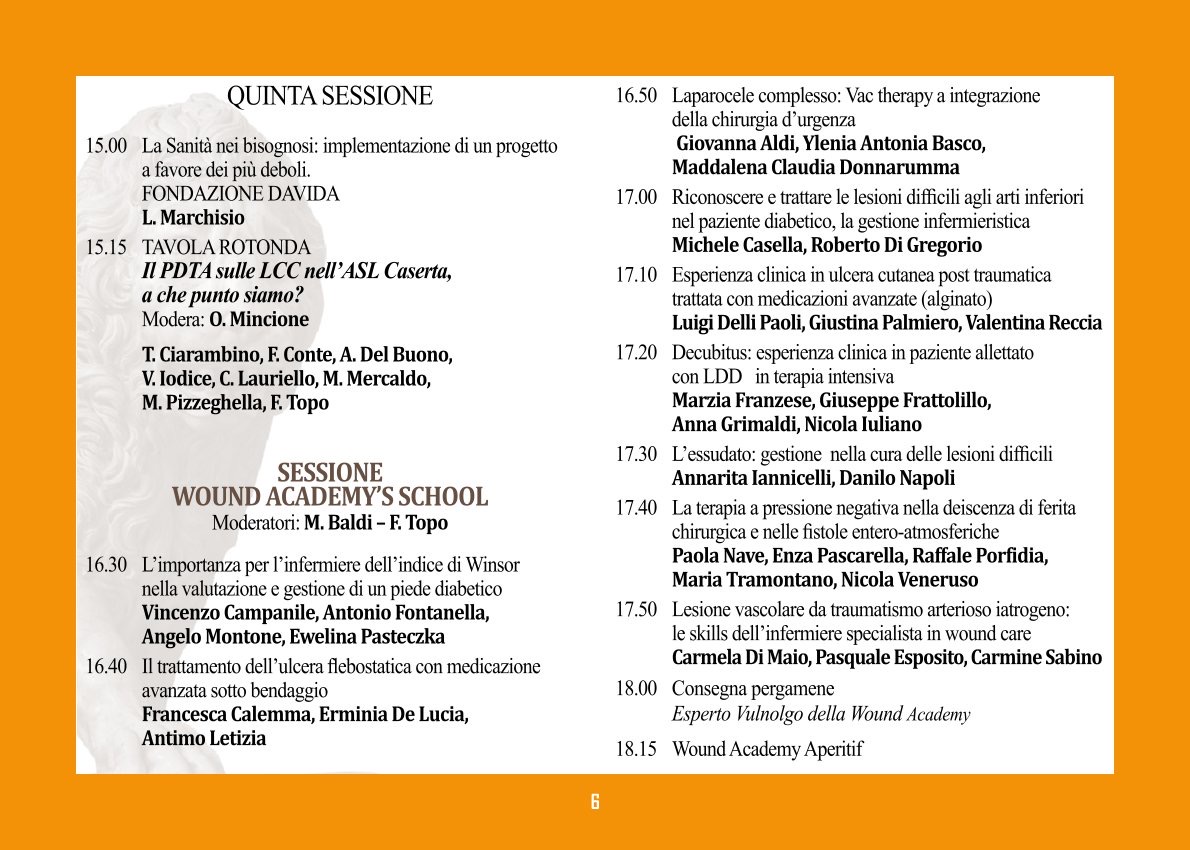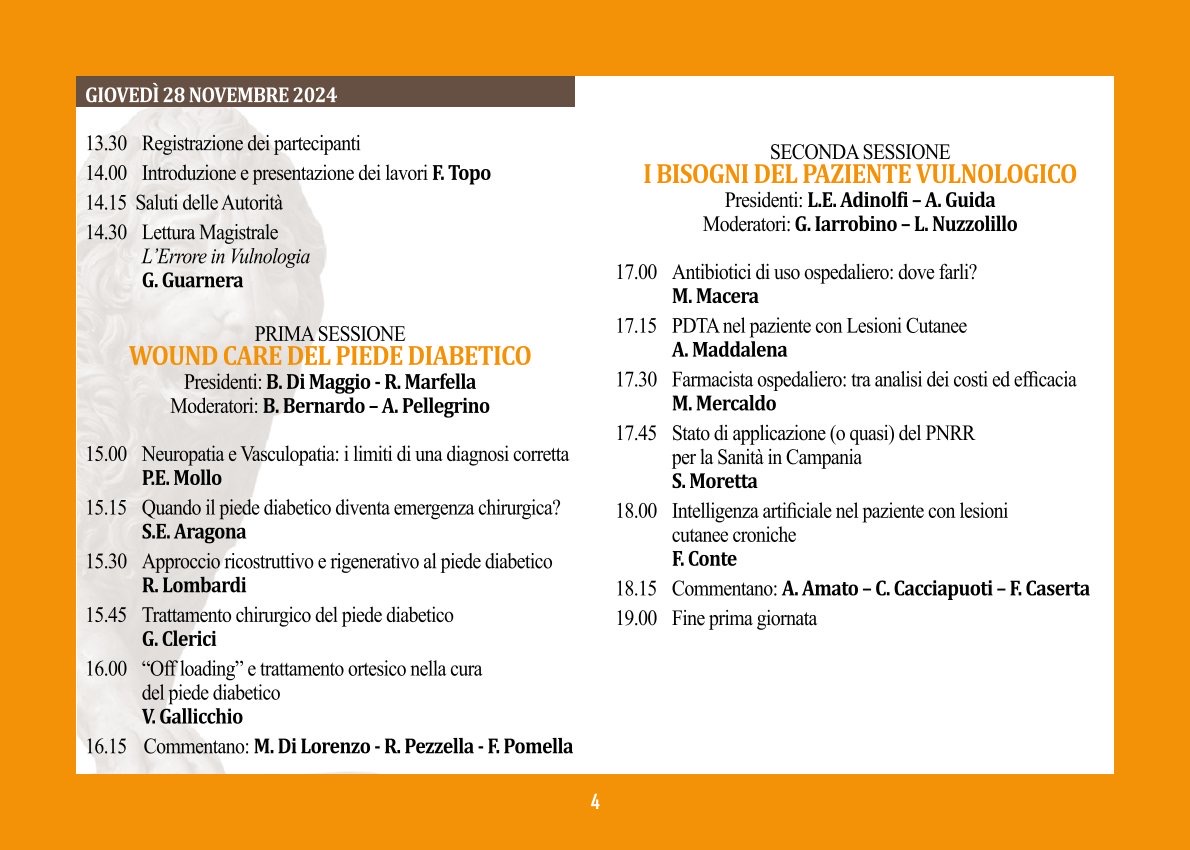 “Anche in questa edizione siamo riusciti a mettere a confronto i massimi esperti sul trattamento della patologia ulcerativa cutanea che parleranno di tecniche consolidate ed innovative, delle ultime innovazioni tecnologiche riguardanti la medicina rigenerativa, stato dell’arto del PNRR finalizzato alla creazione di strutture per la cura di questi pazienti. Non ultimo si parlerà del PDTA, Percorso Diagnostico Terapeutico Attuativo, per il paziente affetto da lesioni cutanee croniche, prodotto dalla Regione Campania ed in attuazione a breve, anche nell’Asl Caserta. Infine anche quest’anno avremo coloro che come Esperti Vulnologi della Wound Academy’s School, attraverso un percorso formativo annuale, riceveranno l’attestato di merito!”.