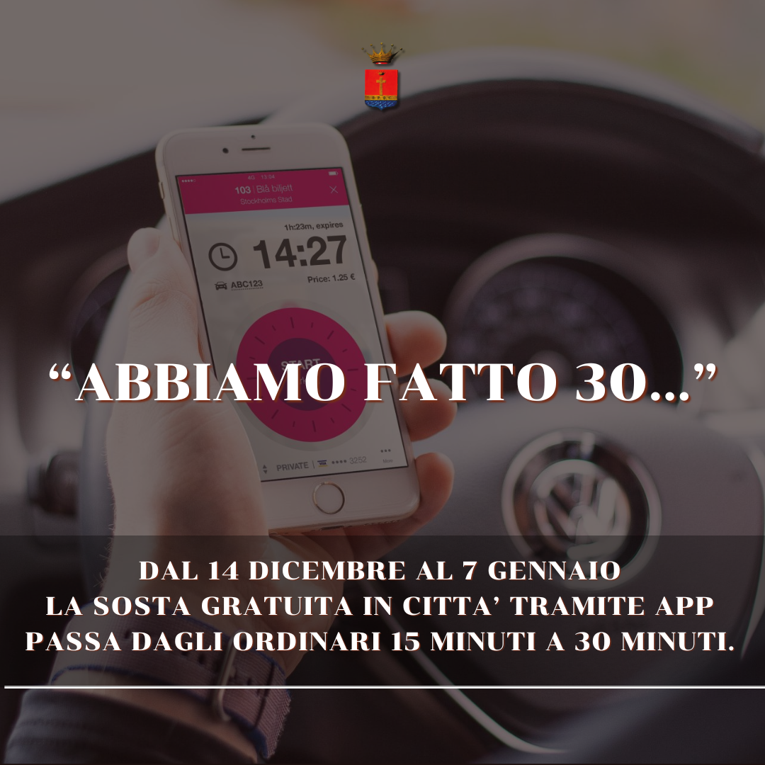 In occasione delle festività natalizie, l’Amministrazione Mirra con l’Assessore Simonelli in sinergia con la società che gestisce il servizio di sosta a pagamento, ha lanciato l’iniziativa “Abbiamo fatto trenta…”, pensata per agevolare cittadini e visitatori in vista delle compere natalizie presso le attività commerciali locali.