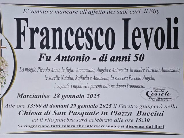 Francesco lascia la moglie Anna e le tre figlie e un vuoto immenso in quanti l’hanno conosciuto ed apprezzato per le sue doti umane. La salma arriverà alle 13 a Marcianise per un ultimo viaggio denso di dolore ed affetto per l’uomo che ci lascia.