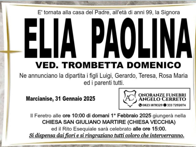 MARCIANISE. Lutto per una famiglia molto nota nella politica marcianisana e nella vita cittadina. E’ venuta a mancare all’alba del traguardo del secolo di vita Elia Paolina: era la vedova di Domenico Trombetta e la madre di Pietro Trombetta, consigliere comunale della Democrazia Cristiana ucciso dalla camorra nel 1992.