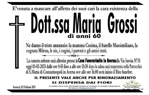La dottoressa Maria Grossi se ne è andata all’età di 60 anni. Era conosciuta in città da molti come una brava persona, disponibile e di buon cuore. La sua prematura dipartita ha lasciato nel dolore e nello sconforto amici e parenti.