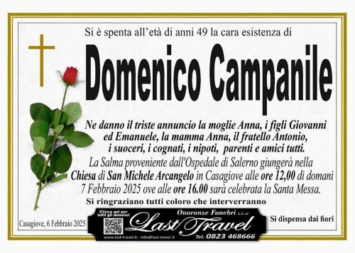 Il suo corpo sarà prelevato alle 12 dall’ospedale di Salerno e giungerà alla Chiesa San Michela Arcangelo a Casagiove dove alle ore 16 sarà celebrato il rito esequiale.