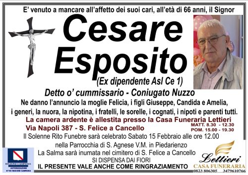 Cesare Esposito, 66 anni di San Felice a Cancello, era ricoverato in ospedale a causa di un brutto male che lo affliggeva. Purtroppo, nonostante abbia combattuto con tutto sé stesso e gli sforzi del personale medico, quel male lo ha consumato fino al tragico epilogo.