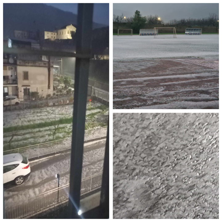 Valle di Suessola. Maxi grandinata nella zona dell’est casertano, nella valle di Suessola. Il campo di calcio comunale di Santa Maria a Vico è rimasto completamente imbiancato.