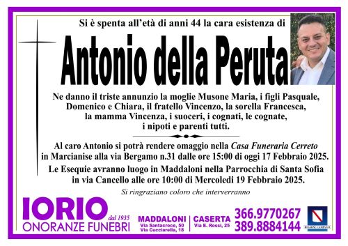 Antonio della Peruta, un uomo di 44 anni, di Maddaloni, si è spento prematuramente. Era afflitto da un brutto male che purtroppo lo ha consumato nel tempo fino al tragico epilogo in una clinica.