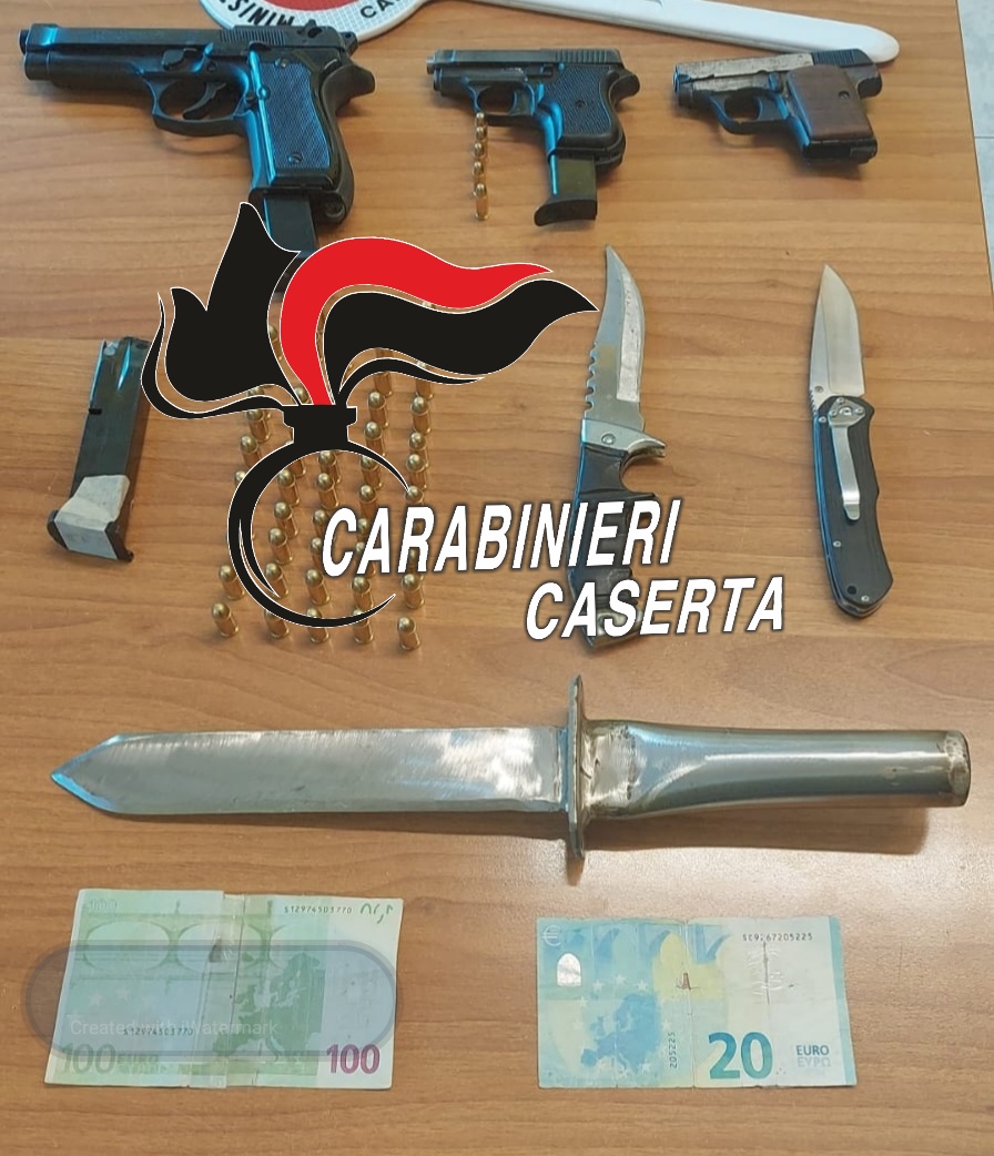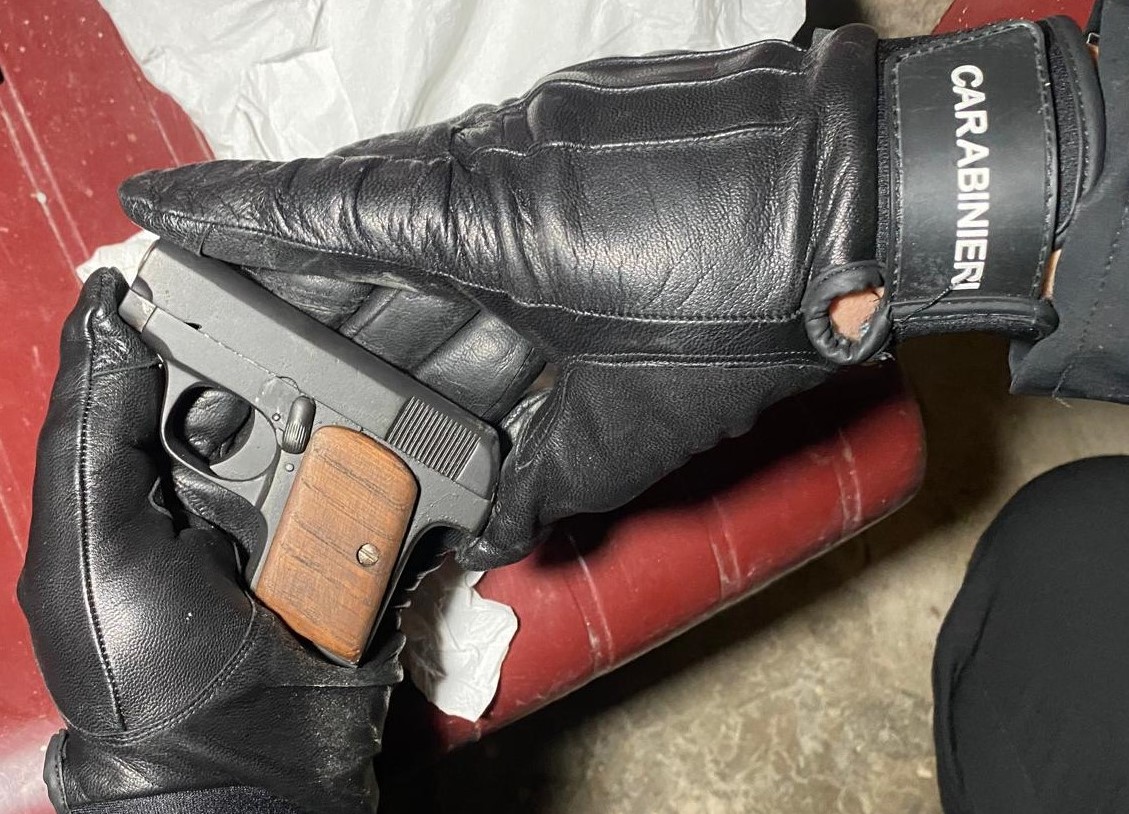 In particolare l’uomo, ancor prima che iniziasse la perquisizione domiciliare, ha spontaneamente consegnato una pistola calibro 8, marca Bruni, modello 315, con canna modificata, comprensiva di 5 cartucce calibro 6,35, nonché ulteriori 5 cartucce cal 9 corto. Nel prosieguo dell’attività, nella sua camera da letto, i carabinieri, con l’ausilio di unità cinofila di Sarno fatta convogliare sul posto, il cui cane Athos è addestrato per la ricerca di armi, hanno rinvenuto e sequestrato una seconda pistola cal. 6,35, priva di marca e perfettamente funzionante. Una terza arma, una pistola a salve marca Bruni calibro 8, con tappo rosso, è stata, invece, rinvenuta nel vano cucina come anche un caricatore cal. 9, un pugnale artigianale della lunghezza complessiva di 41 cm con lama da 24 cm, un coltello a serramanico della lunghezza complessiva di cm 24,5 e lama di 13 cm, un coltello a serramanico della lunghezza di cm 21 di cui 9 di lama e due banconote, una da 100€ e una da 50 €, false.