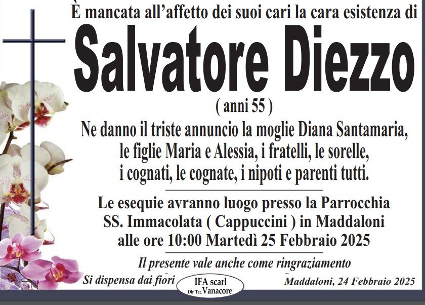 Il rito esequiale avrà luogo presso la Parrocchia SS. Immacolata (Cappuccini) in Maddaloni alle ore 10.