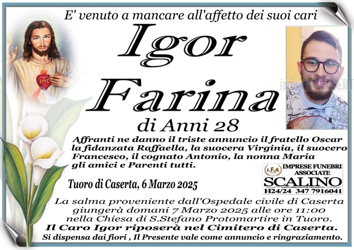 Caserta. Fissati i funerali di Igor Farina il 28enne del capolouogo trovato morto nell’abitazione di via Abbagnano in località Tuoro/Parco Primavera domenica pomeriggio.