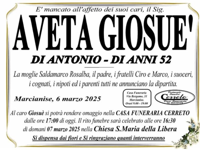 Marcianise. Marcianise piange la scomparsa di Giosuè Aveta, venuto a mancare all’affetto dei suoi cari il 6 marzo 2025, all’età di soli 52 anni.